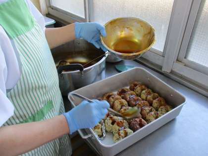 写真2:焼き上がったハンバーグにソースをかけている様子