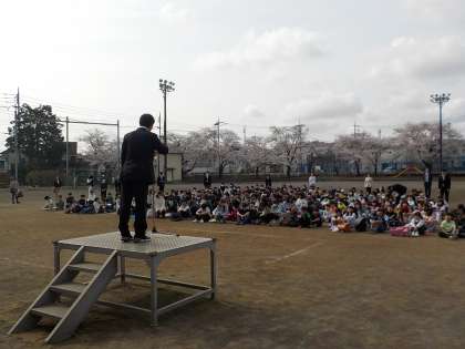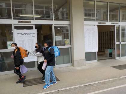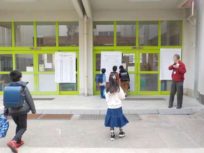 子どもたちは登校後8:15分に各学年昇降口に貼りだされた新しい学年の学級名簿で自分の学級を確認し、校庭に整列しました。