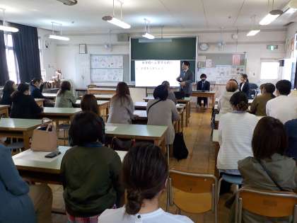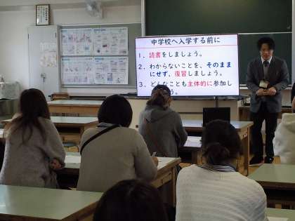 6年生の保護者会では、小中一貫教育のつながりで、元八中の先生に来ていただき、中学校入学までにしておいてほしいことについてお話をうかがいました。