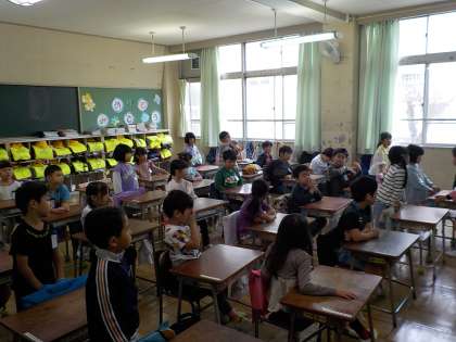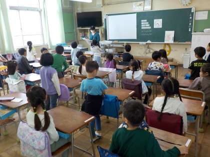 1年2組の朝の会、一人ひとりしっかり返事ができています。
