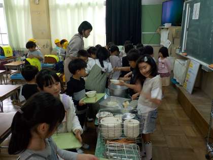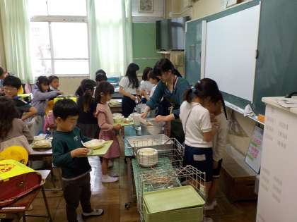 1年生の給食の片付けには、3年生がヘルプに来てくれています。