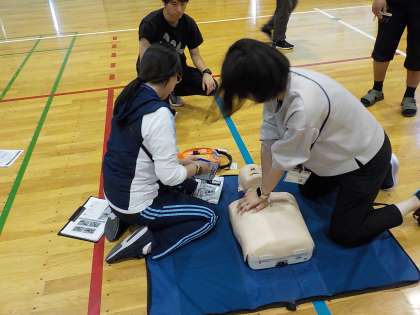 毎年、水泳指導開始前にAEDを用いた応急手当(心肺蘇生法)の教員研修を行っています。
