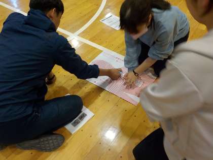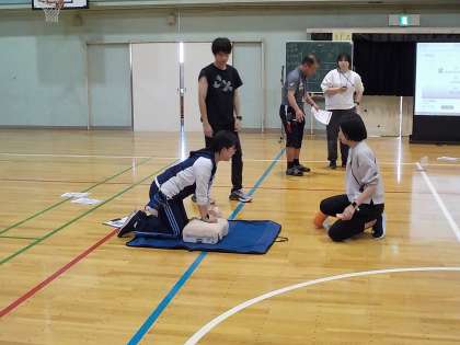 先生たちは全員で交代しながら、胸骨圧迫(心臓マッサージ)やAEDの訓練に真剣に取り組んでいました。