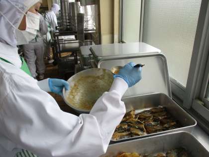 写真1:さばのみそ煮を配缶している様子