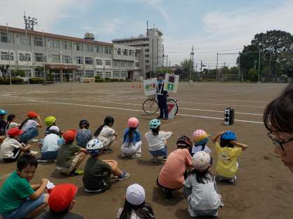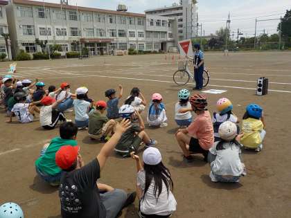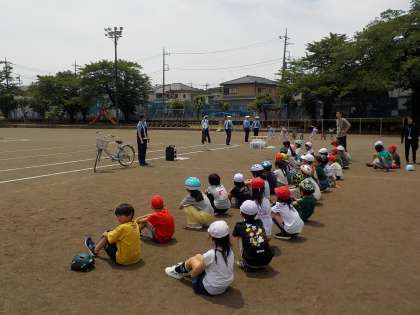 校庭では、交通安全についてのお話や自転車の点検、安全の確認、などについて学びました。