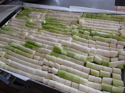 写真1:焼きとり丼のねぎを鉄板に並べ、オーブンで焼きます