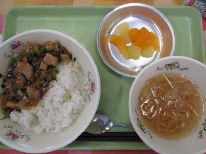 給食では、豚肉の他にたけのこやしいたけ、小松菜を入れて彩りをよくしています。