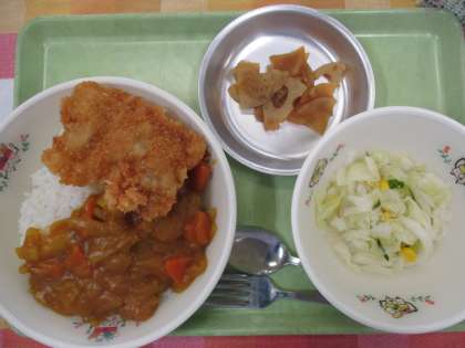 ひみつのカレーライスという絵本と給食のコラボしたメニューです。