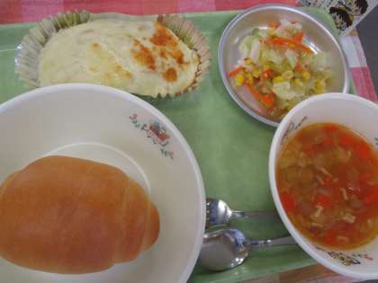 ドリアにはたまねぎやエリンギが使われていますが、足りない分の野菜はサラダやスープで補って栄養バランスの取れた献立にしています。