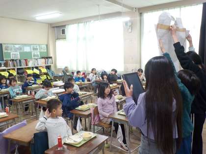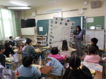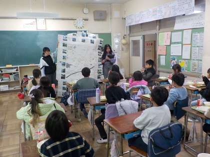 今週の火曜日2月4日の給食の時間に5年生が総合的の学習の時間に調べまとめた「地域安全マップ」を各学級に出かけて発表しました。マップは校舎内に掲示してあります。