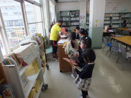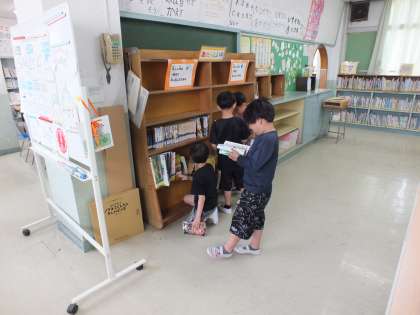 1組は図書の学習、2組は日記を書いていました。