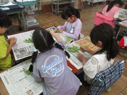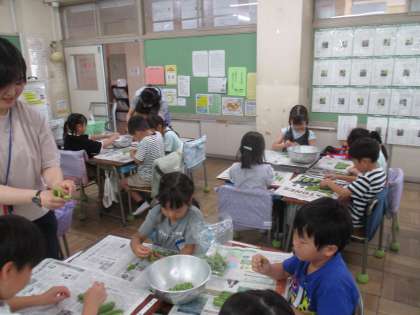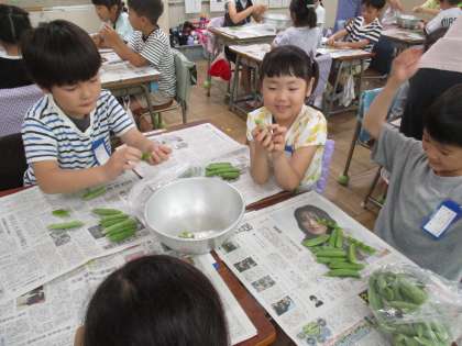 1年2組のグリンピースのさやむきの様子です。