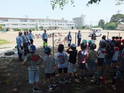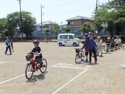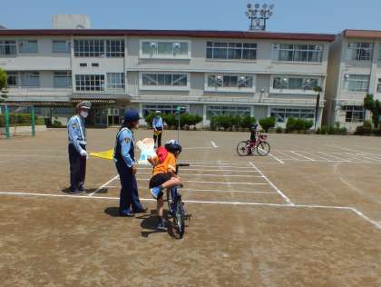 校庭では、交通安全についてのお話や自転車の点検、安全の確認、などについて学びました。校庭での後半は実際に自転車に乗って、コースを走りました。