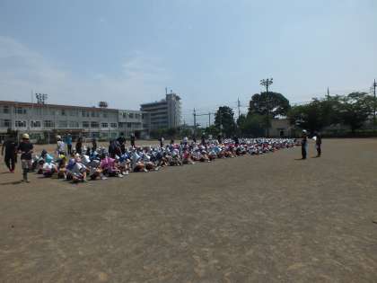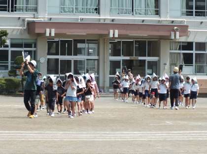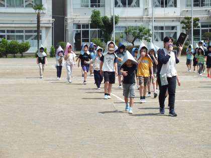 今日は火災の想定で、防災頭巾着用、ハンカチで口を押えての避難でした。