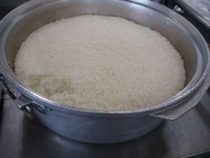 (この後調理員さんが丁寧にごはんをほぐしてクラスごとの食缶に分けます)