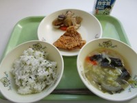 ●今日の給食●・わかめごはん・厚焼き卵・野菜と油揚げのごま和え・みそけんちん...