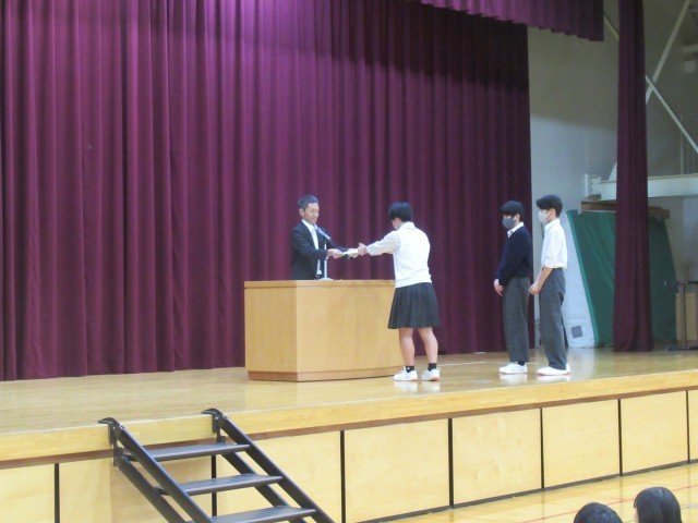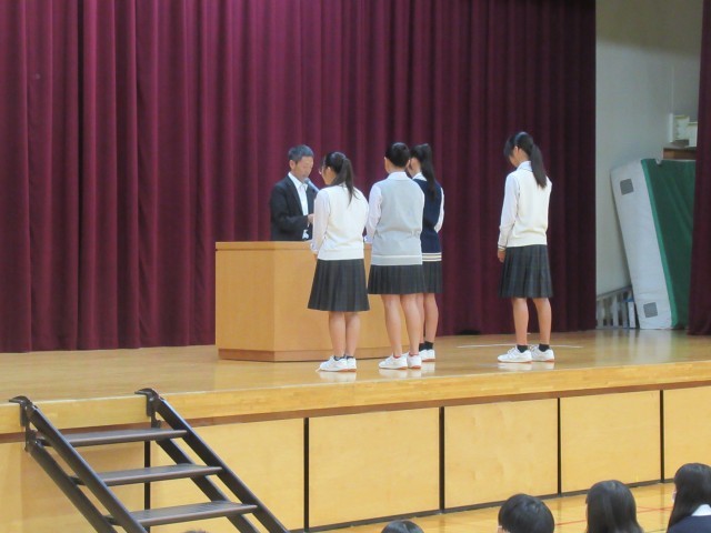10月1日(水)の朝礼で、バドミントン部、陸上部、バレーボール部(男子)の表彰を行いました。