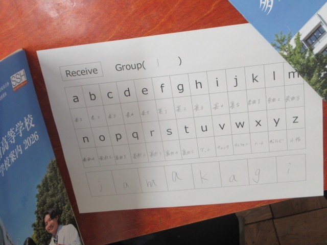 生徒たちは、ハンドサインを一つひとつ確認しながら単語を伝え合い、まるで秘密のメッセージを送り合うような感覚を楽しんでいました。この活動を通して、情報を安全に伝えるための工夫や、暗号化通信の考え方について理解を深めることができました。