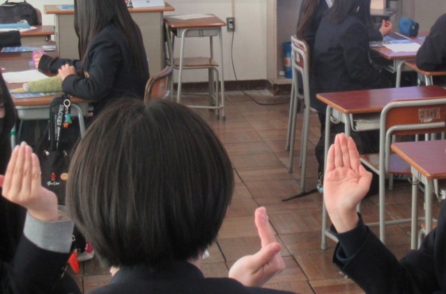 「暗号化通信」の授業では、まずAからZまでのアルファベットそれぞれに対応するハンドサインを自分たちで考えました。次に、そのハンドサインを使い、声を出さずに8文字の英単語を相手に伝える活動に挑戦しました。