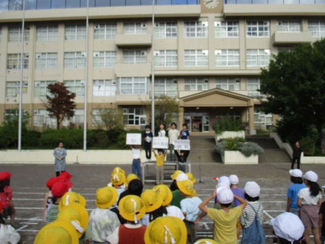 本日は、校庭で全校朝会を行いました。来週行われる「もったいない大作戦」についての話や運動会のスローガン発表等がありました。運動会のスローガンは、「心を燃やして、過去最高の運動会に挑戦だ!」です。25日の運動会に向けて、児童は、一致団結して行うことを意識しました。