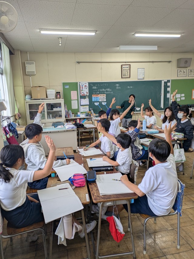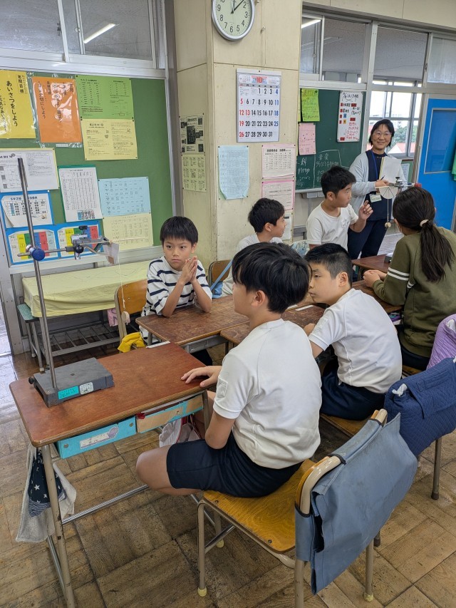 振り子の学習をしています。今日は特別講師として2年生の高麗先生に教えていただきました。5年生に来ている教育実習生への模範授業として行ないました。振り子に付ける重りの重さを変えると一往復の時間が変わるのか実験をして確かめました。皆の予想と違っていてびっくりしました。
