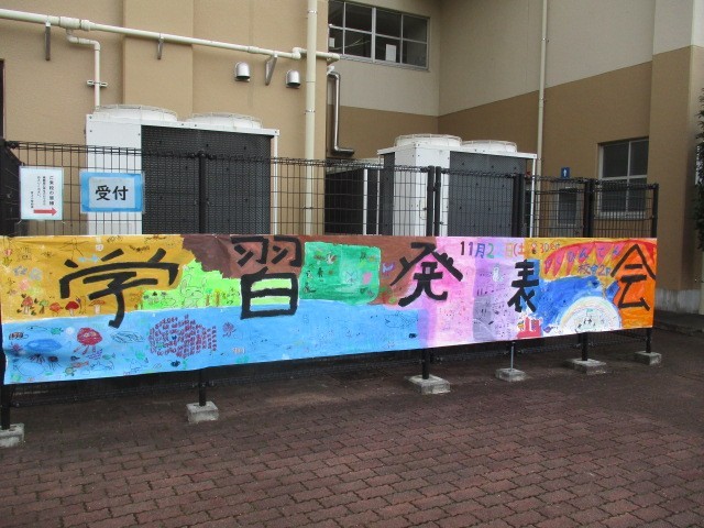外の花壇前に、「学習発表会」の表示を取り付けました。