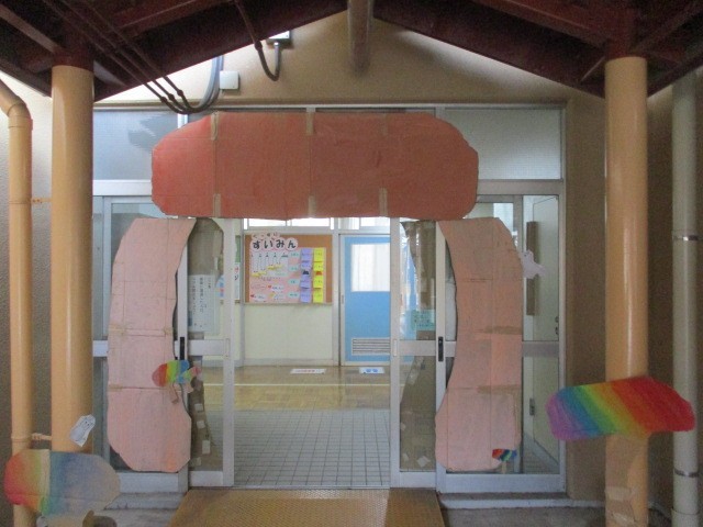 体育館への渡り廊下の入口にもまだ未完成ですが装飾が入ります。