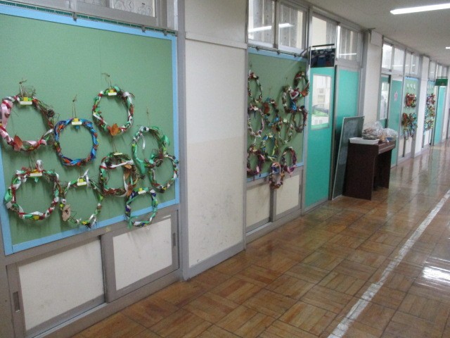 1年生は、朝顔のつる、2年生は、さつまいものつるでリースづくりを行いました。一人一人が飾りを用意して、飾りの付け方を工夫していました。とても素敵な廊下になりました。
