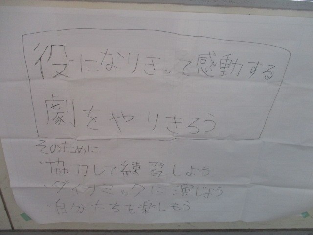 6年生は、学習発表会で演劇発表を行います。学年でめあてを決めて廊下に貼り、本番に向けて取り組んでいます。6年生にとって小学校最後の学習発表会となります。役になりきって感動する劇となり、過去最高の学習発表会となることを期待しています。
