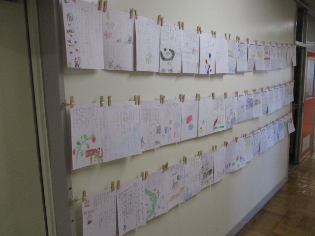 先週の金曜日まで、読書旬間がありました。その活動の一環として、子供たちそれぞれの「おすすめの本」の紹介を掲示しています。2年生は、2階の放送室と2年生の教室の間の廊下の壁に展示しています。2年生の子供たちが一生懸命書きましたので、ぜひ来校の際はお立ち寄りください。