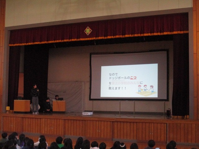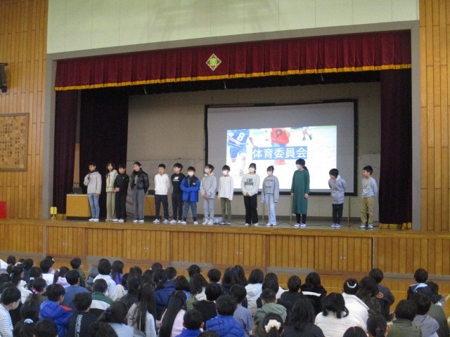 朝の集会の時間を使って、体育委員会の発表がありました。体育委員会の仕事の内容や3学期に予定している「ドッジボール大会」のお知らせがありました。ドッジボールのお知らせでは、ドッジボールが上手くなるコツを動画を作成して、皆に教えてくれました。発表を聞いて、皆、体を動かすことが楽しみになってきました。