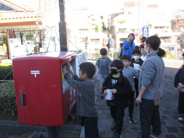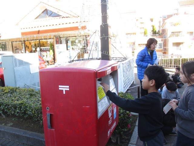 国語の時間に書いた年賀状を近くの郵便局のポストに入れにいきました。しっかり届きますように!と願いを込めて投入しました。行き帰りには、道路の歩き方や道路の横断の仕方を勉強しました。