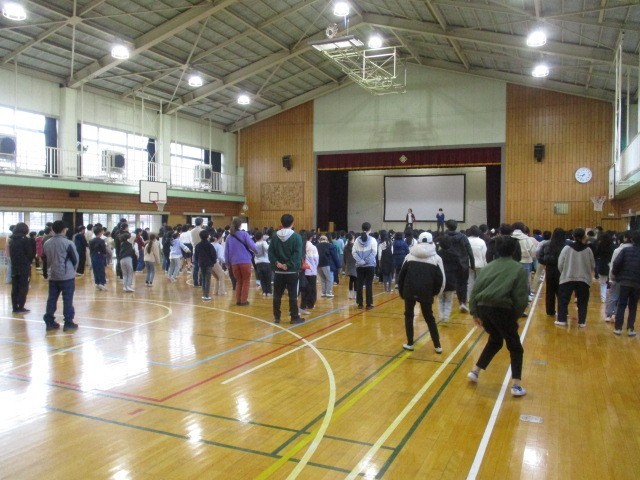 集会委員会が企画と運営をしました。今日のゲームは、体育館で「指示に合わせて動く」ゲームをしました。司会の人が「前」と言うと、みんな前に動きます。「右」と言うと右に動きます。慣れてくると、逆バージョンにも挑戦しました。今週で二学期も終了です。みんなで楽しくゲームをして、今週をスタートしました。