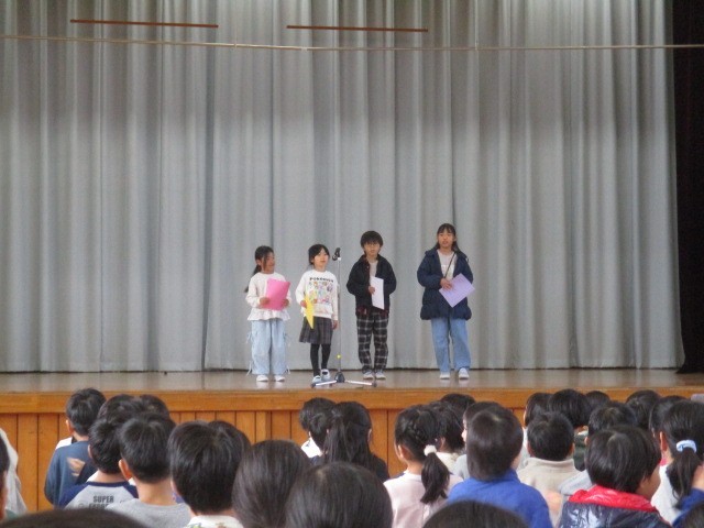 82日間あった二学期も今日で終了となります。二学期最後の日に終業式を行いました。まずは、私から二学期に何ができるようになったのか、何がわかるようになったのかしっかり振り返り、自分の成長を実感することと、命を大切にすることの二本立てで話をしました。その後、1年生と3年生の代表の人が二学期に頑張ったこととして発表をしてくれました。とても堂々として立派な発表でした。