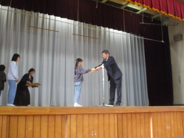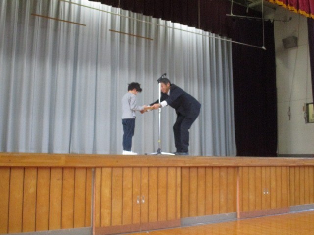 終業式に引き続き、二学期に様々なコンクール等で入賞をした人の表彰式を行いました。みんなで拍手をして頑張りを讃え合いました。