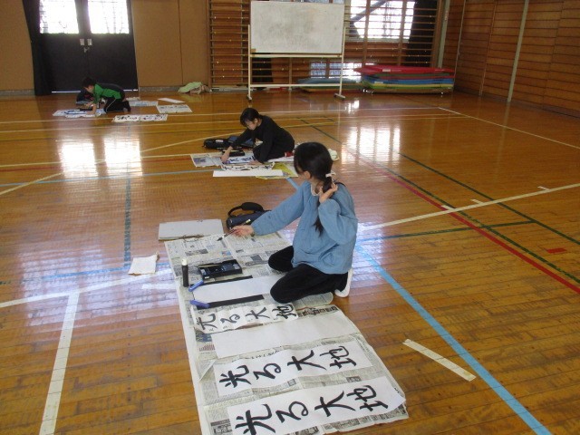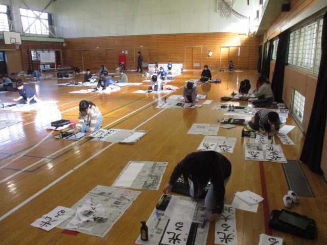 お正月らしく「春の海」が流れる中、書き初めをしました。それぞれ気持ちのこもった様子に、体育館が「凛」とした雰囲気につつまれていました。