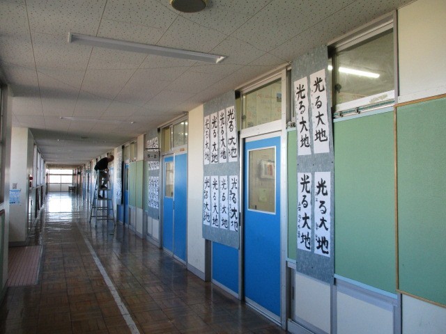 今日も書初め展の準備を行いました。3年生以上は毛筆となるため、廊下壁側の高い位置から掲示を行います。脚立に乗り、気を付けてスクールサポートスタッフさんが掲示をしてくださいました。明日から書初め展が始まります。お待ちしております。