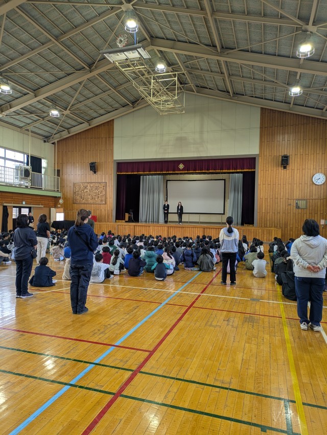 校長の話の次は、2学期に2年生と4年生にインタ−ンシップで来ていた学生からお別れの挨拶がありました。