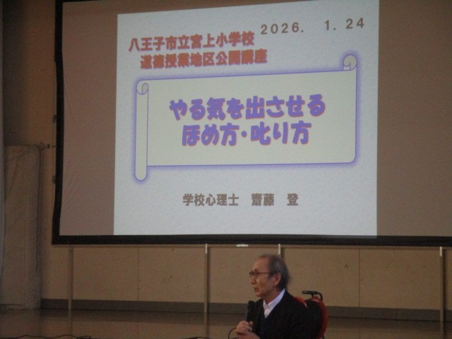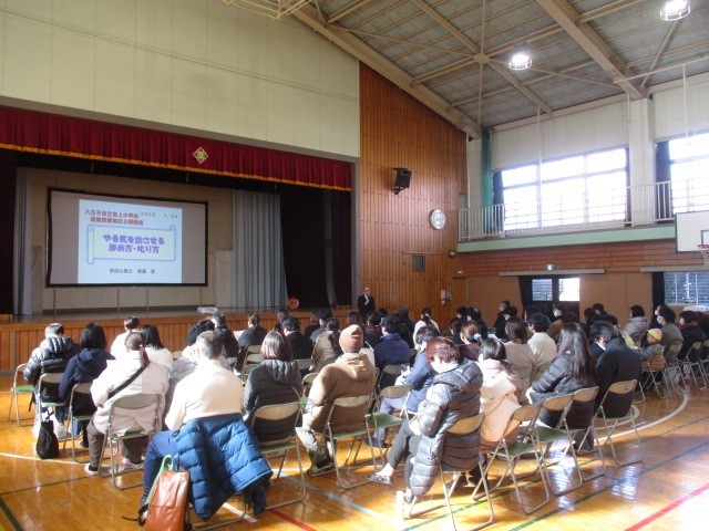 学校心理士の斎藤登先生をお呼びして、「やる気を出させるほめ方・叱り方」の題名でお話をいただきました。「子育てって何?」「しつけって何?」「子供とどうかかわればよいか?」という内容で、とても参考になる話を聞くことができました。たくさんの保護者の方が足を運んでくれました。