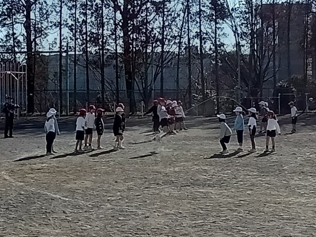 2年生は、体育で多様な動きの学習で、長縄跳びにチャレンジしていました。運動時に音楽をかけてリズムにのるのも効果的でした。笑顔で楽しく取り組んでいました。