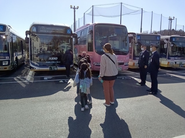 本日は2年生の生活科見学があり、京王バス南大沢営業所に徒歩で行きました。営業所に入るとたくさんのバスが駐車しており、その中の水素バスに乗せていただきました。バスの中は広く、水素で動くと聞き、みんなは驚いていました。行く前に事前学習で質問内容を考え、答えを予想して見学に向かいました。学んだことをしっかりとメモをして真剣に見学していました。マナーよく、ルールもしっかりと守れました。営業所の皆様、ありがとうございました。