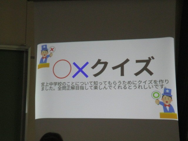 宮上中学校の生徒会が6年生に向けて、宮上中学校の学校生活について説明をしてくれました。部活動や委員会活動、行事、制服紹介、小学校との違い等について、「●×クイズ」なども使って、分かりやすく教えてもらいました。小グループに分かれての質問タイムもあり、宮上中学校について知ることができただけでなく、中学校生活が楽しみになる内容でした。