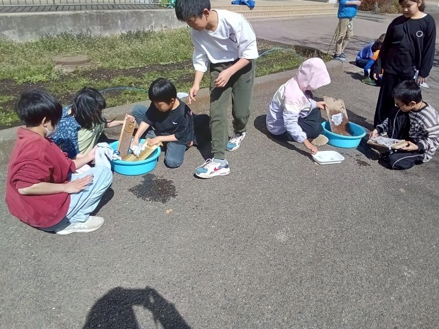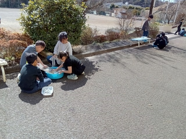 本日の3年生は、総合的な学習の時間で洗濯板体験を行いました。昔の道具の学習を生かした体験活動で、洗濯板を使って雑巾を洗っていました。とても上手な手付きで、雑巾の汚れがきれいにとれて、真っ白な雑巾に変わっていました。昔の人の知恵を知ることにもなり、良い体験だと感じました。子どもたちの真剣な表情も素敵でした。