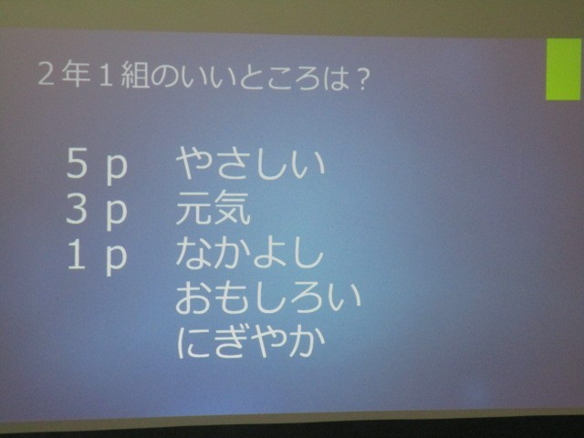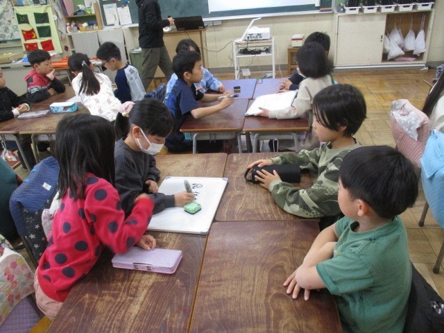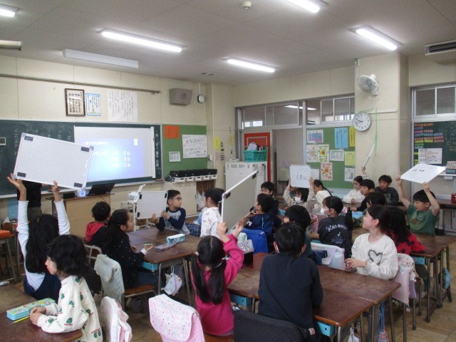 班対抗クラスクイズを行っていました。「一番好きな教科は?」とか「クラスの良いところは?」等・・・班で話し合い、ホワイトボードで発表しました。どの班が優勝したかは、お子様が家に帰ってきたらお尋ねください。