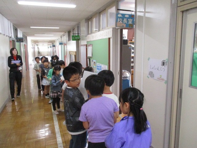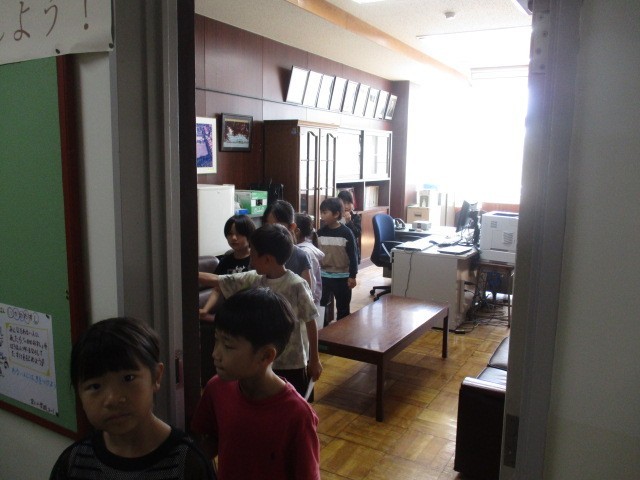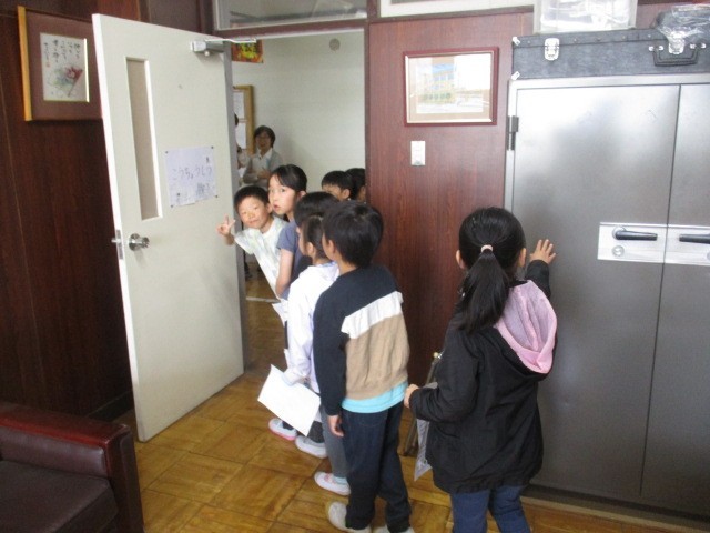 低学年は学校探検の学習で、校内のいろいろな教室や場所を調べています。今日は2年生の人が校長室に来ました。しっかりドアをノックして、「失礼します。〇〇です。」と言ってから校長室に入りました。「大きな金庫の中に何が入っているの?」「机が三つある」「教室より小さいね」・・・との感想でした。校長室の次は、図書室に行くそうです。