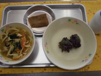今日は野菜たっぷりの五目うどんに、ヨモギを練りこんだ若草団子に、イカの松かさ煮です。ヨモギの香りがとても良くおいしく仕上がりました。