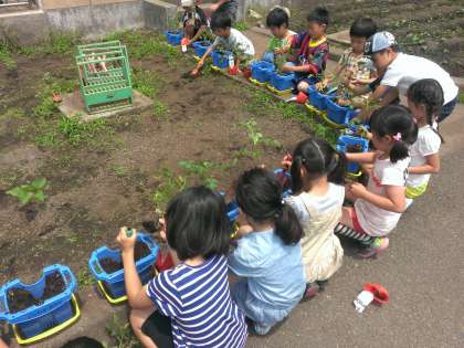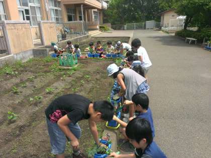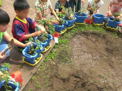 そして今週より夏休みに向けての学習がまた始まります。生活科の学習で以前に畑にサツマイモを植えましたが、今度はそれぞれの植木鉢にミニトマトの苗を植えました。