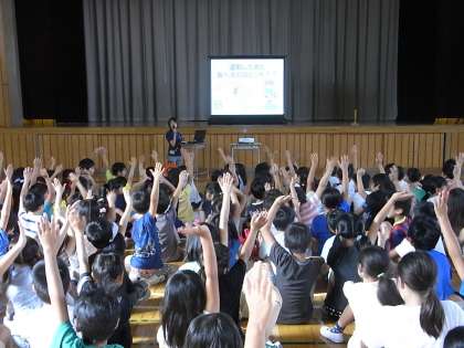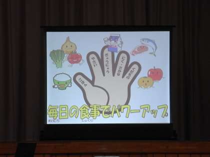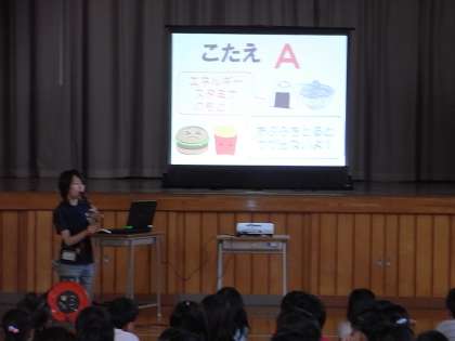10月3日(金)の児童集会は、食育集会でした。食べ物の栄養の取り方や、どの食べ物にどんな身体に良い成分があるのかということを、クイズ形式で学習することができました。