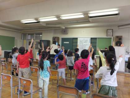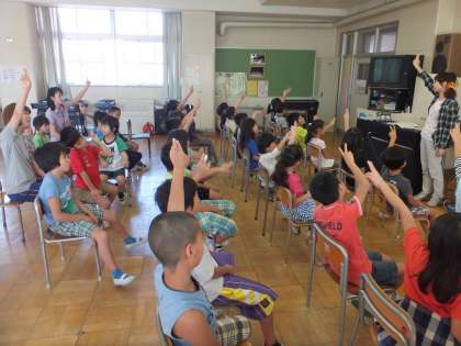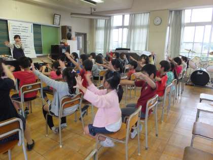 歌の「にじ」は手話付きで元気よく合唱します。久しぶりに音楽室で早坂先生の授業を受けました。