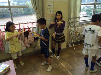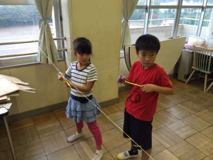 応用の実験として、ゴムの力で動くロープウェイを作って実験をしました。